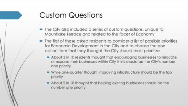 The survey also included a series of questions unique to Mountlake Terrace and related to the local economy. Approximately one-third of the respondents thought that encouraging businesses to relocate or expand their operations within Mountlake Terrace should be the city’s top priority. And about 20% thought that helping existing businesses is most important. Improving infrastructure was the top priority of 25% of residents.