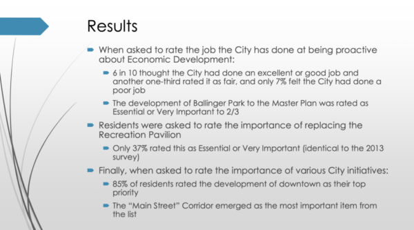Regarding economic development, 63% of respondents rated the overall quality of business and service establishments as excellent or good. However, other related items such as employment opportunities, shopping opportunities and health care received ratings lower than the national averages. City Treasurer Mick Horton noted that the latest ratings for the vibrancy of the downtown/commercial areas, along with the overall quality of business and service establishments, continued to trend upward from previous survey results.