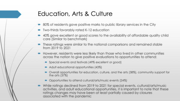 Residents were less likely than those who lived in other communities to give positive evaluations for opportunities to attend special events and festivals, opportunities to attend cultural/arts/music events, adult educational opportunities, community support for the arts, and overall opportunities for education, culture, and the arts.