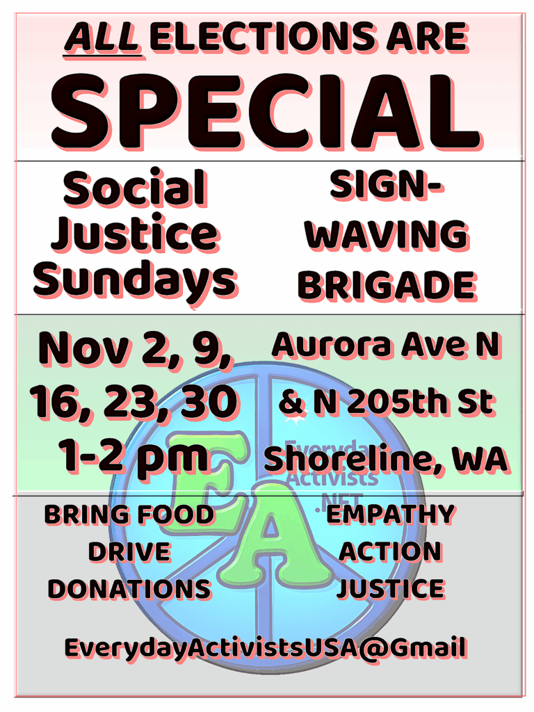 Join Everyday Activists for “Social Justice Sundays” sign-waving every Sunday in November (Nov. 2, 9, 16, 23, and 30), 1-2 p.m. at the intersection of Aurora Ave N and N 205th St., at the Shoreline-Edmonds line.