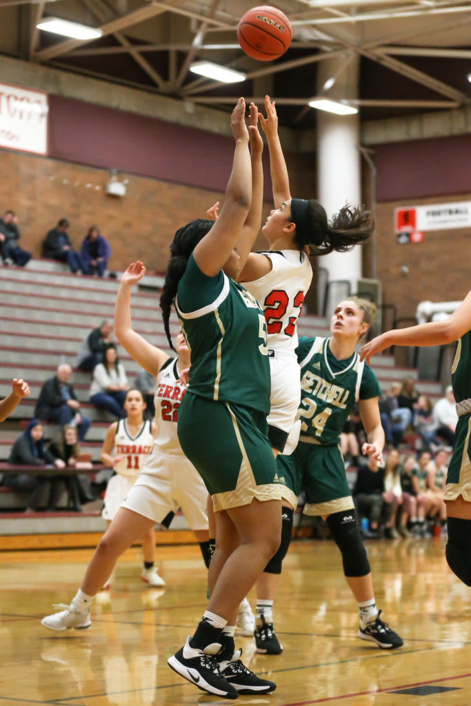Elise Colvin shooting over MG’s Alexus Atkins