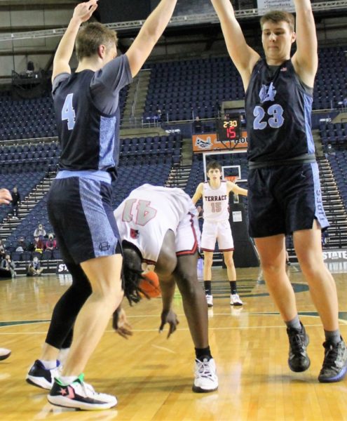 The Hawks took just their second lead of the game (and first since the first minute) with 2:17 to go, 69-68, on a Jeffrey Anyimah inside bucket. Anyimah then converted two free throw attempts with 43.3 seconds left to bump Terrace’s lead up to 71-68. But Gig Harbor’s Luke Browne sunk a 3-pointer from the left corner with 29 seconds to go to tie the game at 71.