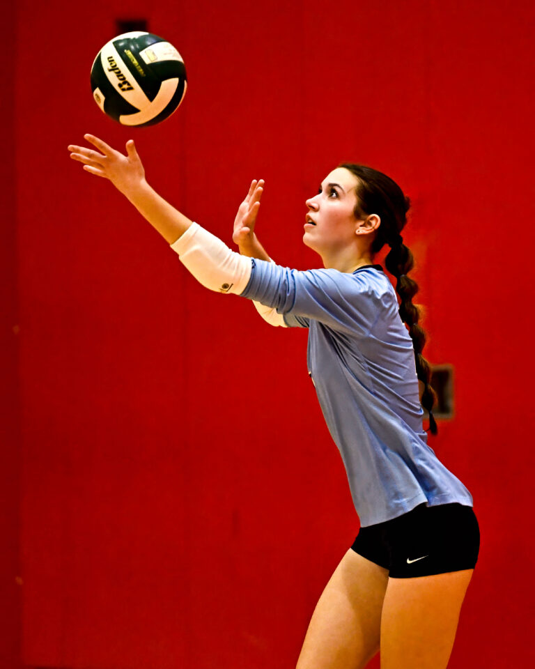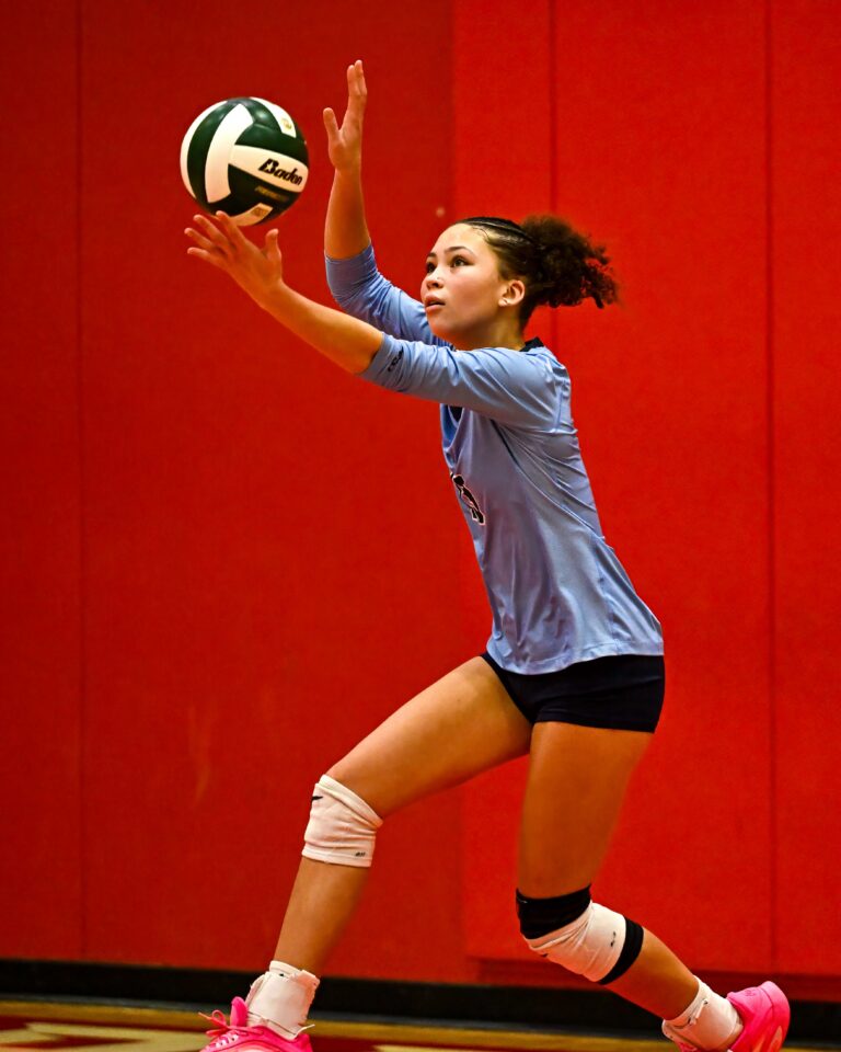 Mavs senior Rian Paris starts her serve against Stanwood.