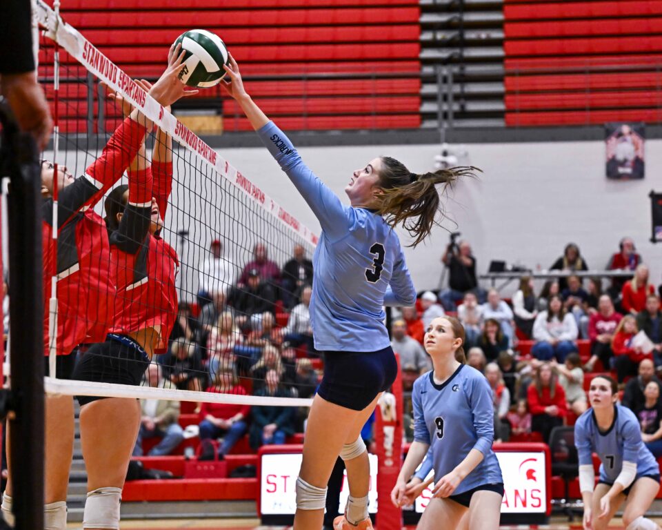Meadowdale High School senior Violet DuBois (3) meets two Stanwood blockers at the net.