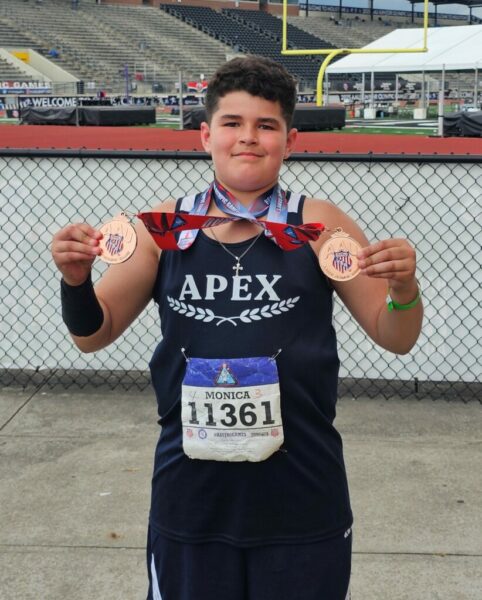 Monica won two medals at the 2025 AAU Junior Olympics held last week outside of Houston, Texas. Monica placed fourth (out of 60 competitors) in the discus and seventh (out of 79 competitors) in the shot put in the national event’s 11-year-old division.