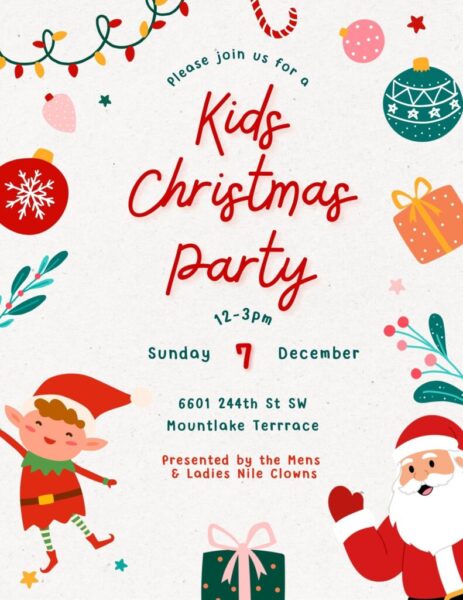 The Nile Shriners Center will host a free children’s Christmas party, “A Visit with Santa Claus and his Elves,” on Sunday, Dec. 7, from noon to 3 p.m. at 6601 244th St. SW in Mountlake Terrace.