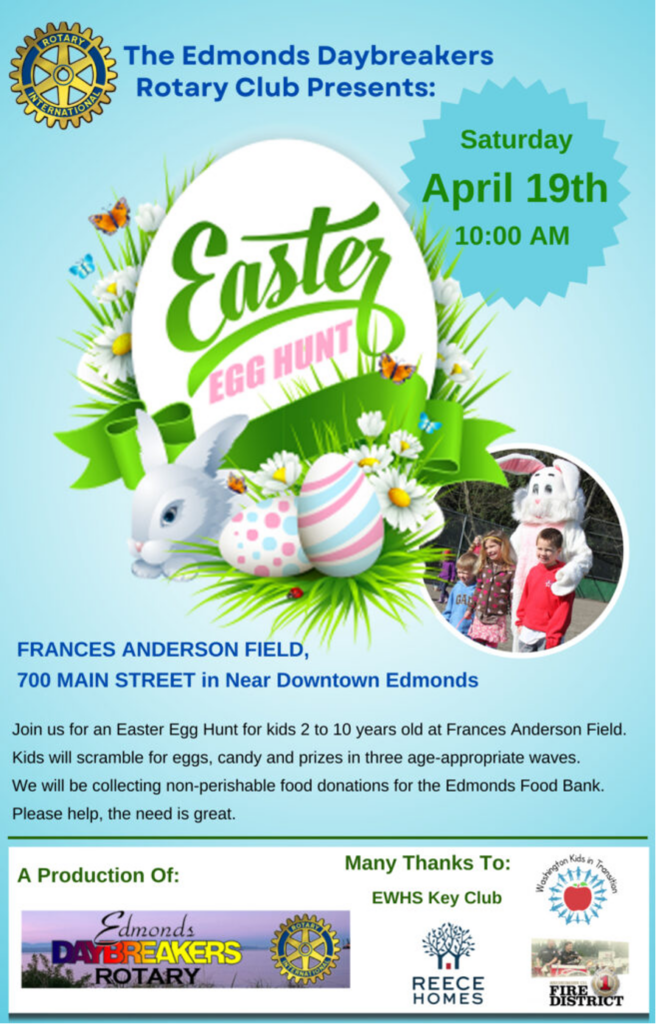 The Edmonds Daybreakers Rotary Club invites families and children of all ages to join in the fun at the upcoming Annual Easter Egg Hunt, happening on Saturday, April 19, 2025, at 10 a.m. at Frances Anderson Field in downtown Edmonds. This free community event is a beloved springtime tradition and promises an egg-citing morning full of smiles, surprises and plenty of colorful eggs!