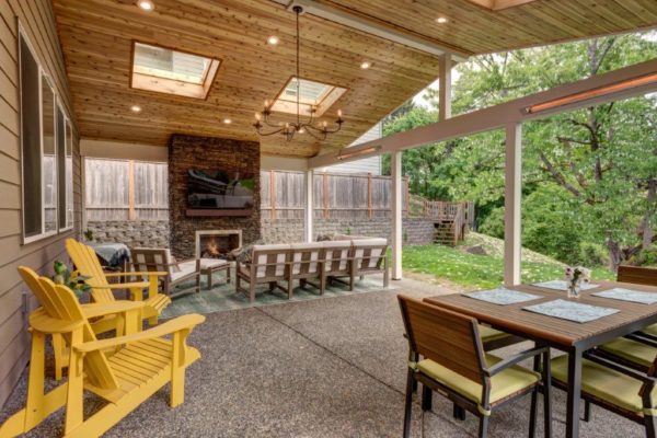 To allow the family to enjoy the space year-round and create a climate-controlled environment, the design integrated wall-mounted electric heaters, gas fireplace and remote-controlled screens. The space retains heat, and the skylights add natural lighting throughout the seasons. The chandelier finishes off the ambiance.