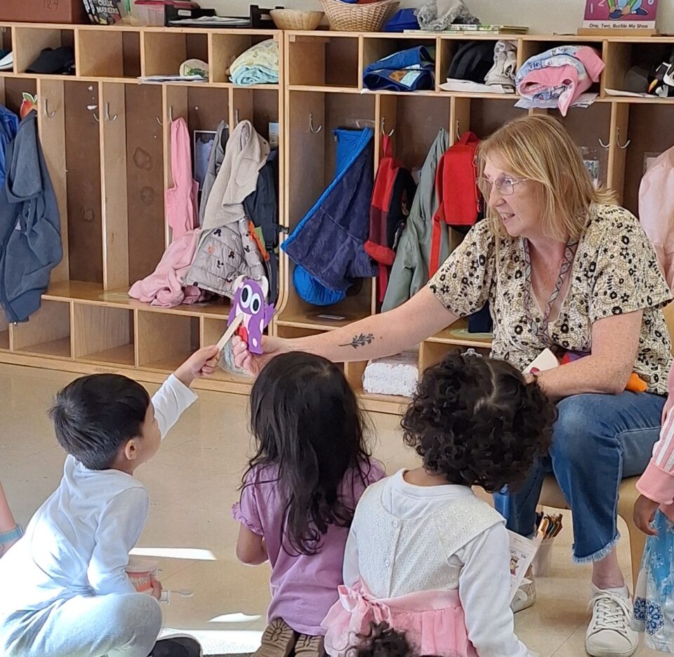 Teacher Jennifer Amend during circle time holding up a purple paper animal while a preschool student holds a Popsicle stick to it and points out its nose.
