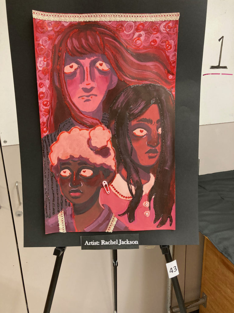 Saturday’s event also included a student-hosted space with works curated by Zero Kosciuk, a junior, to fit a selected theme. “Curating was kind of a mess for me,” she said. “It was hard to find artists I feel like really spoke with my work, but I was able to find a few like Rachel Jackson, and I feel like her works very well with mine. But for me, I was just trying to put pieces together that I felt the proudest of and felt said a similar story.”