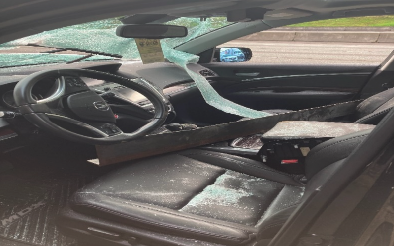 An unknown male pedestrian was observed on the 164th Street Southwest overpass throwing debris onto Interstate 5. A black Acura SUV was northbound on Interstate 5, passing under the overpass when it was struck by a large steel beam approximately 51 inches long. The beam went through the front windshield and came to rest in the front-passenger area of the Acura.